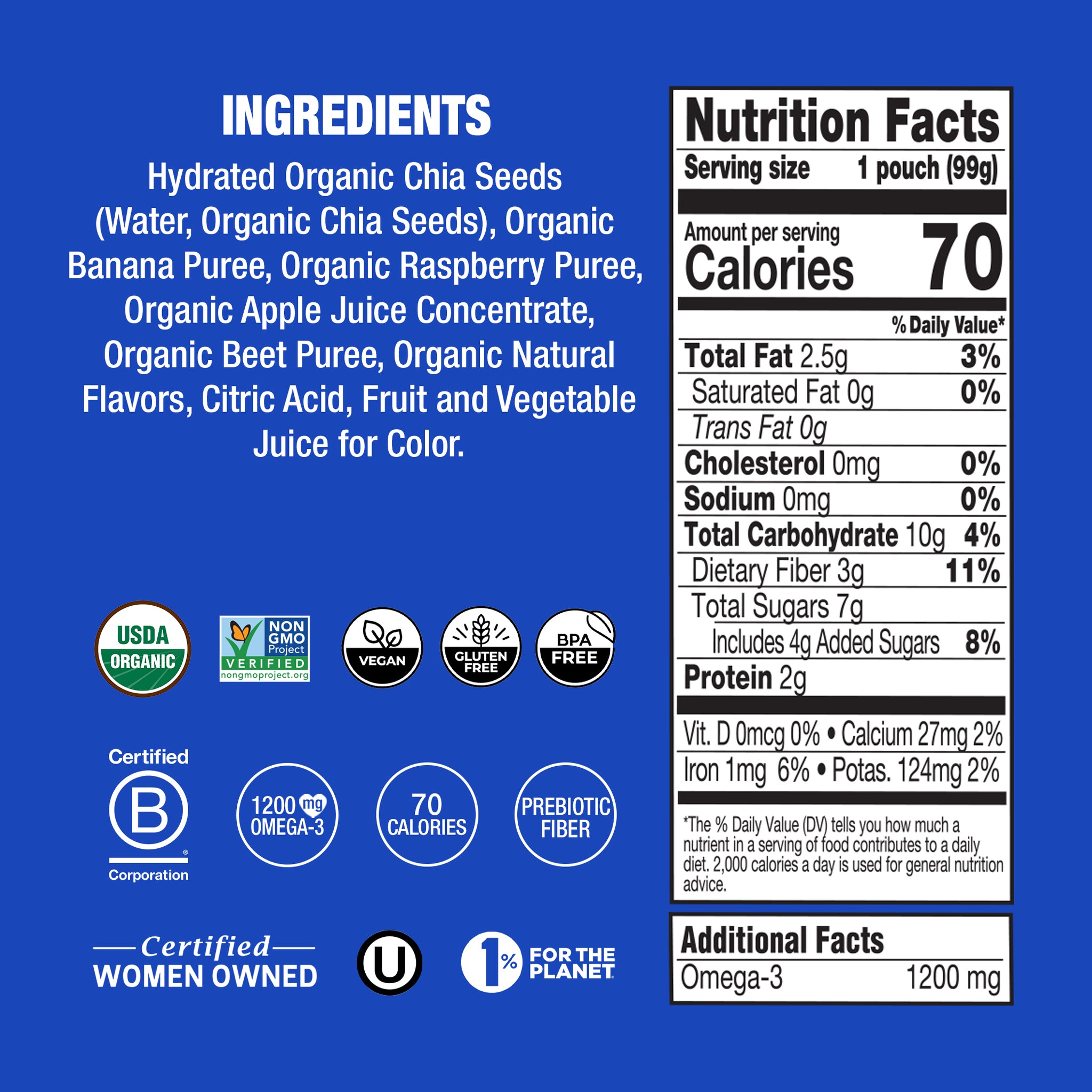 Organic raspberries bursting with flavor are lovingly combined in a rich puree with organic chia seeds for an easy Chia Squeeze that bursts with flavor and vital nutrients designed to nourish your body and delight your taste buds. Each pouch is packed with 1200mg of essential ALA Omega-3, plant-based protein, and gut-friendly prebiotic fiber to support digestive health, brain function, and sustained energy—all without artificial ingredients or preservatives.